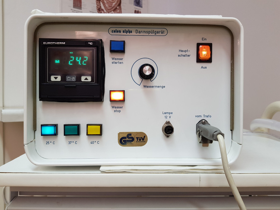 Mithilfe eines medizinischen Colon-Hydro-Gerätes wird während ca. 45 Minuten der Dickdarm etliche Male mit körperwarmem Wasser aufgefüllt und gespült. Es handelt sich hierbei um ein in sich geschlossenes System, sodaß es zu keiner Unterbrechung oder Geruchsbelästigung kommt. In Seitenlage wird ein eingefettetes Darmröhrchen vorsichtig ein paar Zentimeter in den Enddarm eingeführt. Am äußeren Ende des Darmröhrchens sind zwei Abzweigungen, eines für den Wasserzufuhrschlauch, eines für den Abflußschlauch. Der Zufuhrschlauch ist mit dem Gerät verbunden, dieses wiederum mit dem Trinkwasseranschluß. Im Gerät wird die Temperatur und der Druck reguliert, der Abflußschlauch führt zum Abwasserrohr.